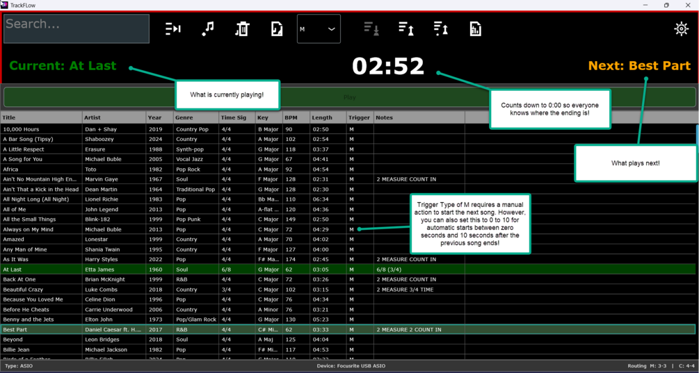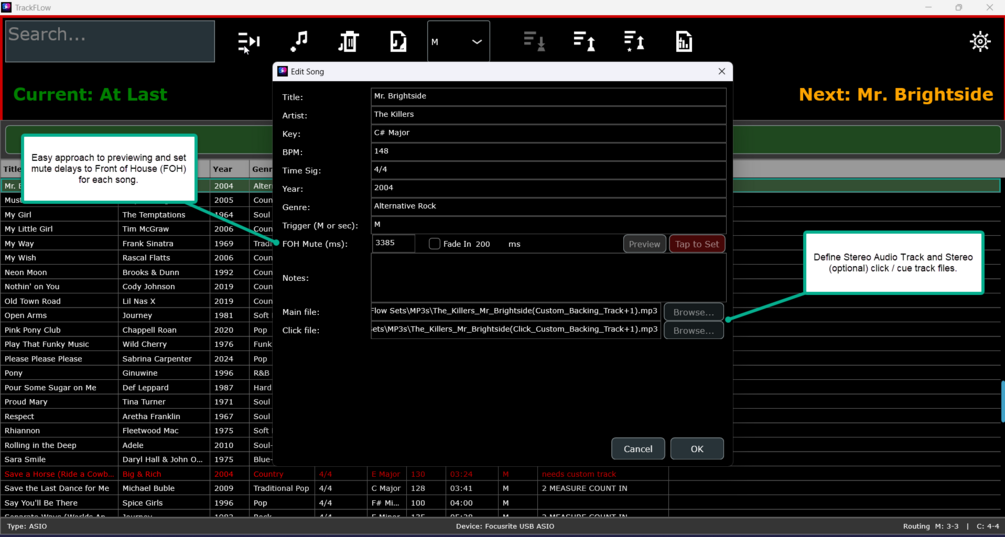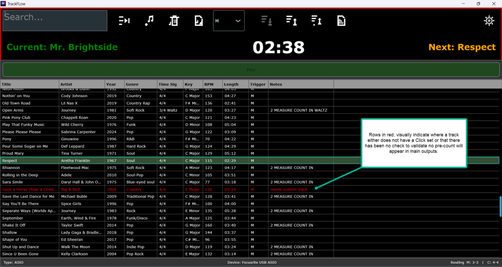- Auto-Mute Safety: Visual warnings identify tracks with no "Intro Silence" set, preventing the audience from hearing the count-in.